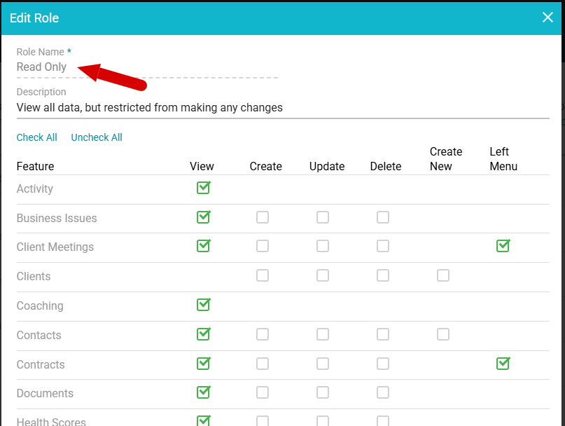 When updating or creating roles, the different areas in Kapta can be configured as needed. Notice in this example of the Read Only role that users are only given view access.