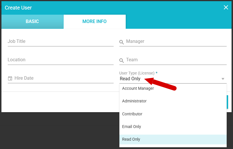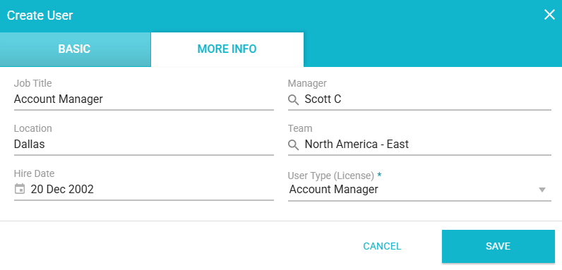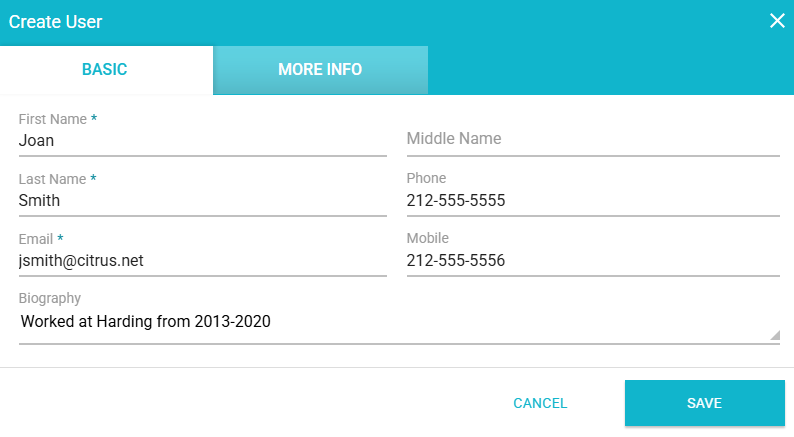 There are two tabs on the Create User window. The Basic tab is for standard contact details and a short biography.