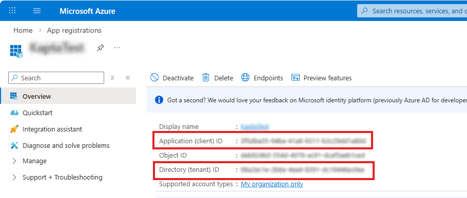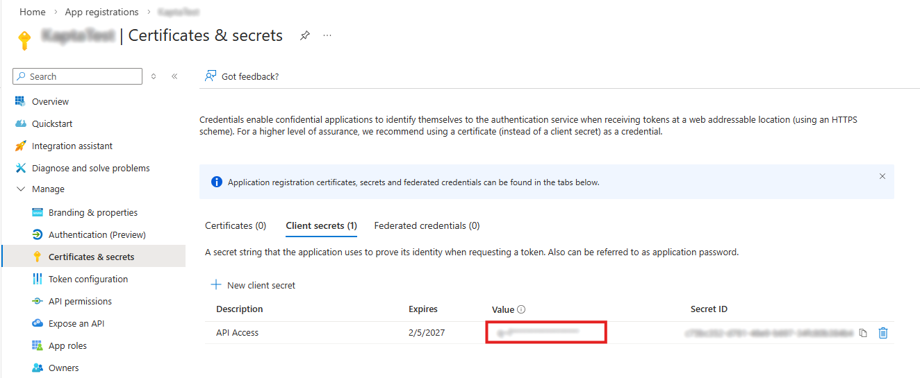 Client secret values are only revealed during creation, so if the value is not saved separately, a new client secret may need to be created. For Kapta, make sure you select the Value and not the Secret ID.