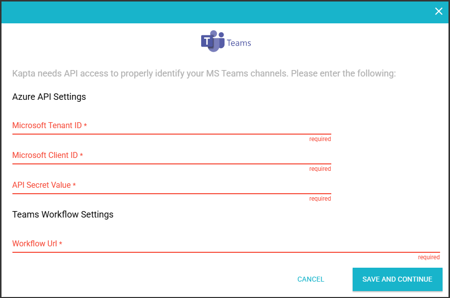 Microsoft Teams requires the use of a workflow to receive messages from Kapta and post them to the appropriate channels. See the information below to set up your workflow and obtain a Workflow Url.