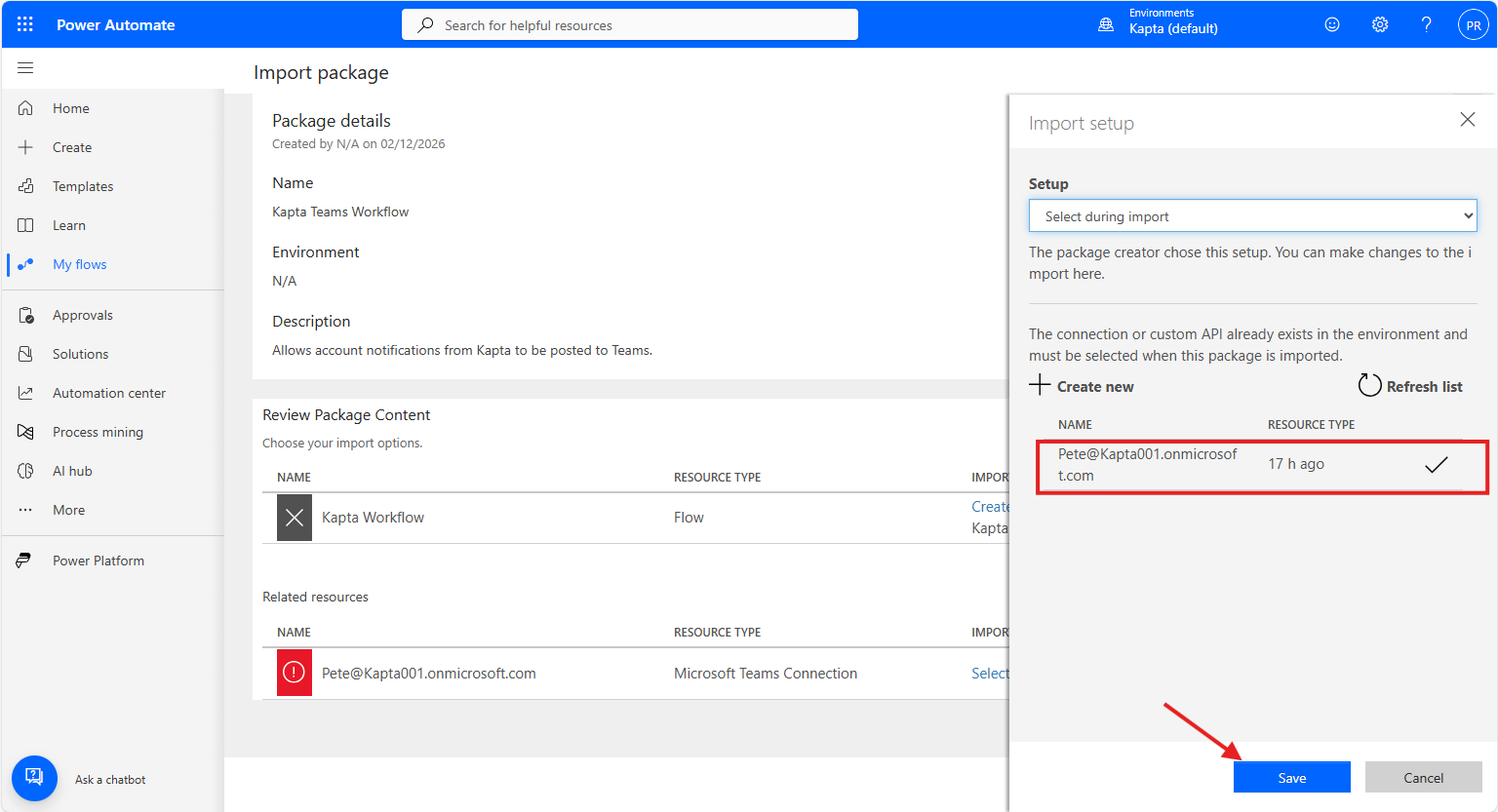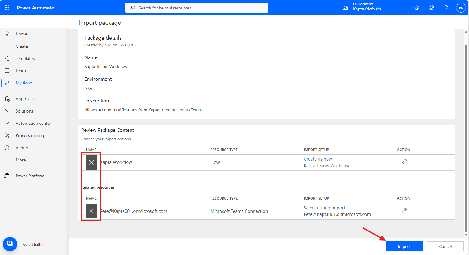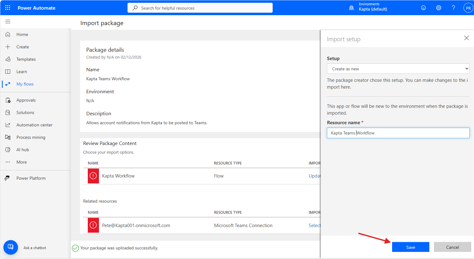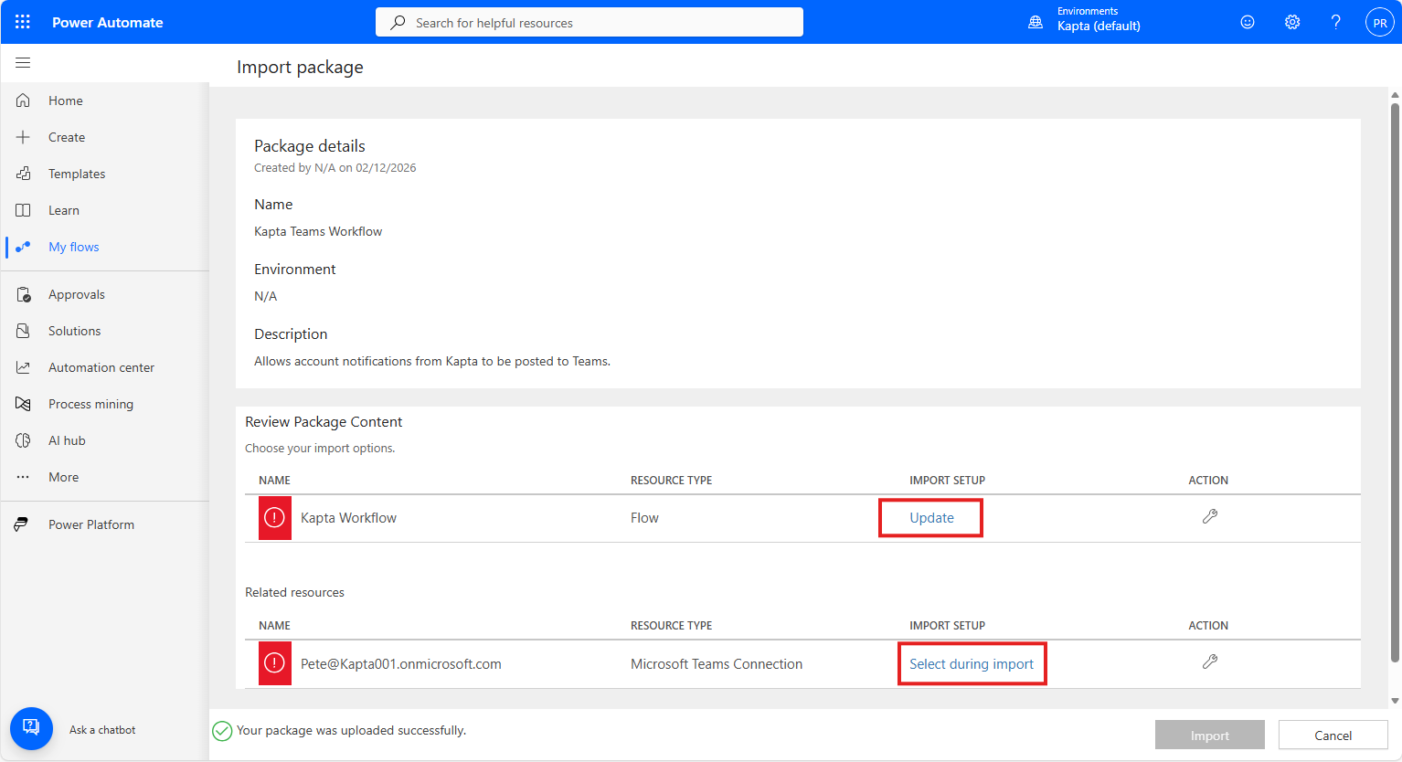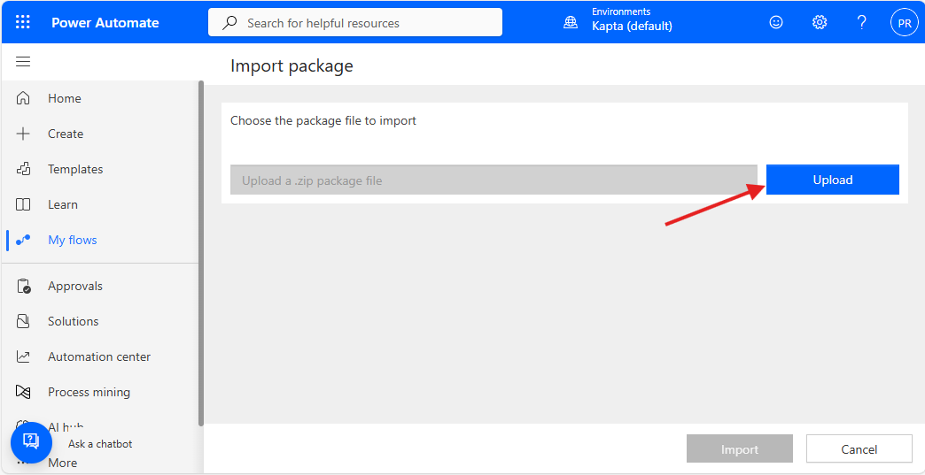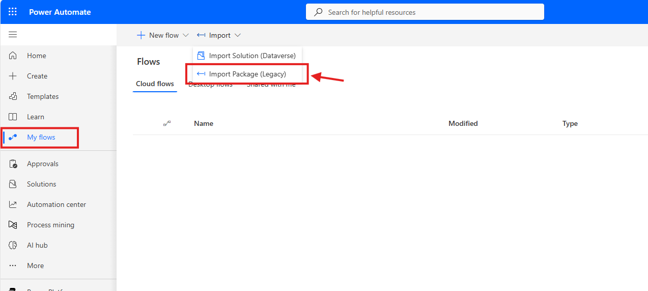 Navigate to Microsoft Power Automate for your team, open the My Flows menu on the left, and select Import Package from the Import menu.