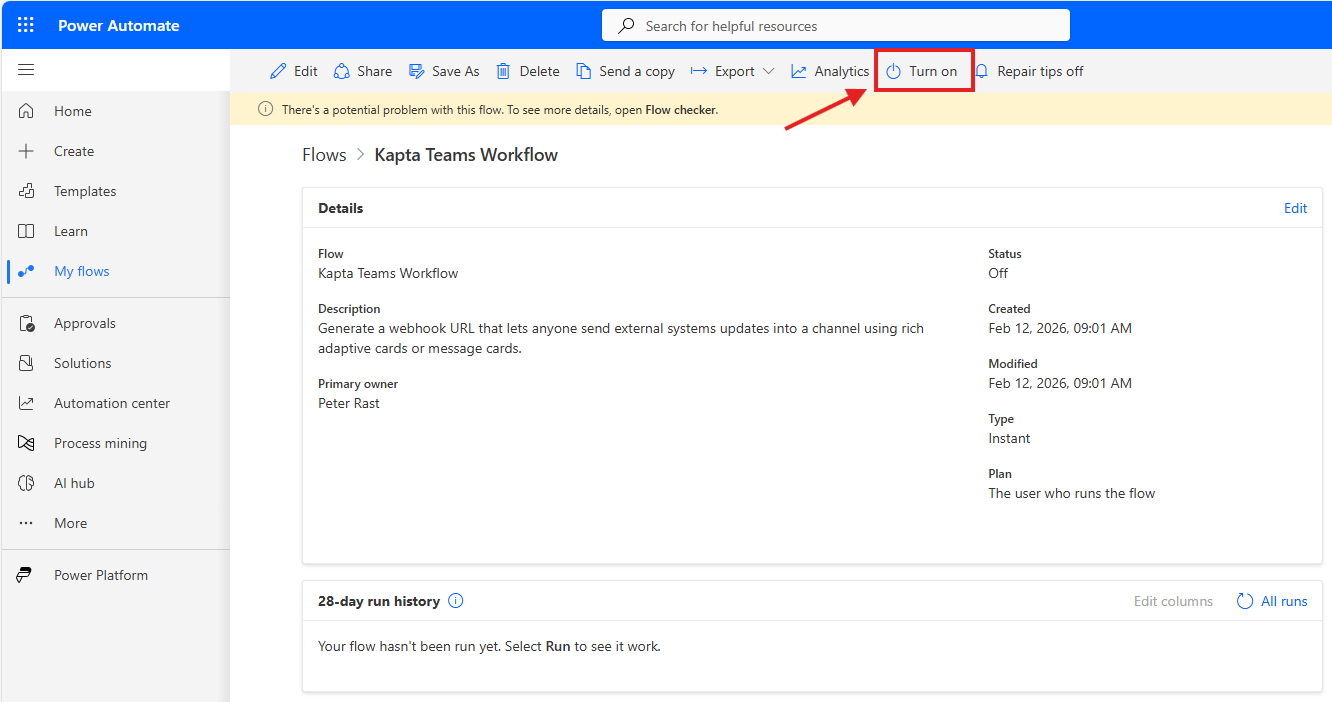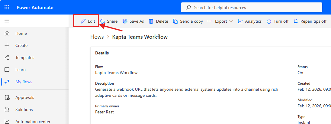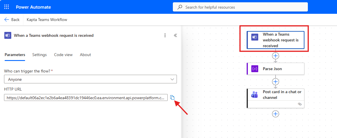 On the workflow Edit screen, click the top item in the workflow, and then click the copy button next to the Workflow Url. This will copy the Url, which can then be pasted into Kapta as the Teams Workflow Url.